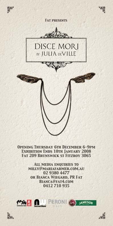 We are having another party, this time for Julia Deville, and the new "Disce Mori" Range. Julia's stuff is incredible and the exhibition will be well worth checking out, not hindered by the fact that Fat knows how to throw some serious parties, and a look at the sponsors should seal the deal for most.
